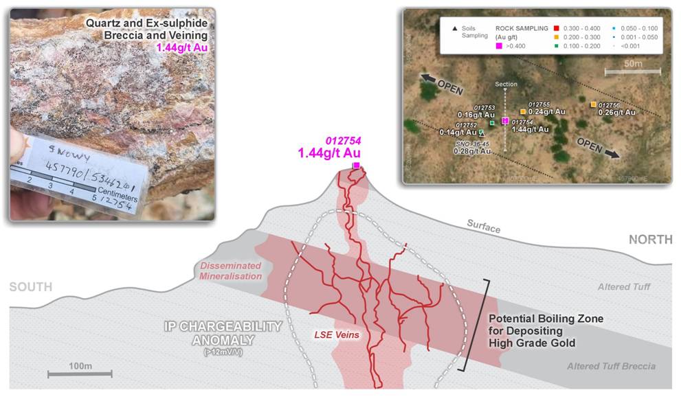 "The latest mapping and rock chip geochemistry is delivering encouraging results at Snowy. Recent field work by East Star's geological team has included several mapping and sampling transects over the Snowy alteration system with encouraging gold results at surface. We have updated our deposit model to a low-sulphidation epithermal system based on the geology observed at surface. This deposit type is characterised by geological similarities seen in notable deposits around the world, particularly in Nevada. We're excited to continue testing this new model, which has the potential to host a large gold system."