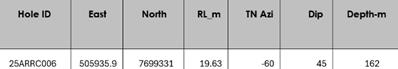 | 25ARRC006 | 505935.9 | 7699331 | MGA94_Zone_50 | 19.63 | -60 | 45 | 162 |