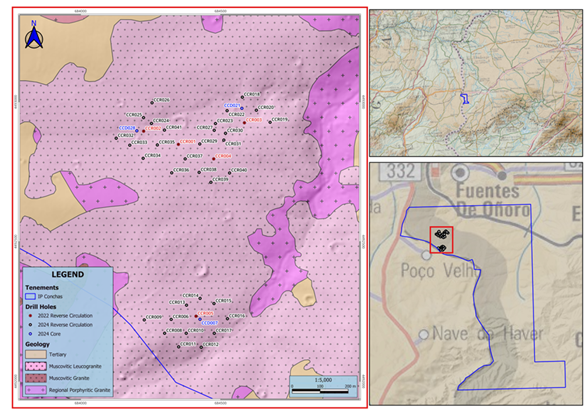 Berkeley conducted a small drill program comprising five broad spaced reverse circulation (RC) holes for a total of 282m in 2022 to test a Sn-Li soil sampling anomaly. Anomalous results for Li, Sn, Rb, Cs, Nb and Ta obtained from multi-element analysis of drill samples were reported in 2023, demonstrating Conchas' potential for several critical and strategic raw materials included in the European Commission's Critical Raw Materials Act (CRMA). The drill results included 25m @ 0.56% Li2O & 0.22% Rb2O from surface (CCR0002).